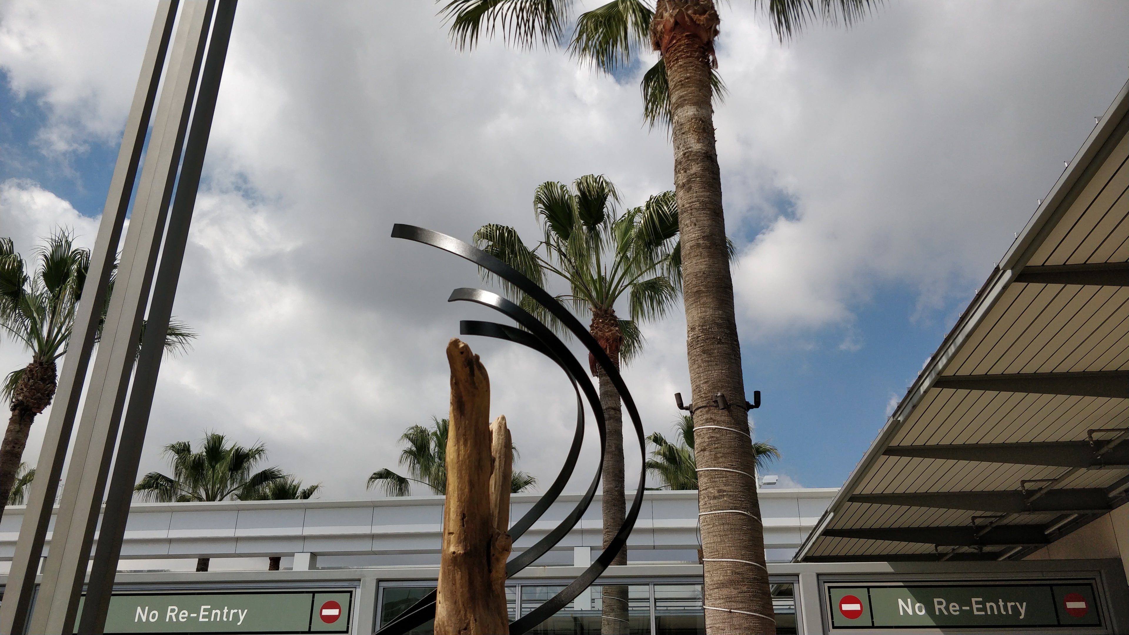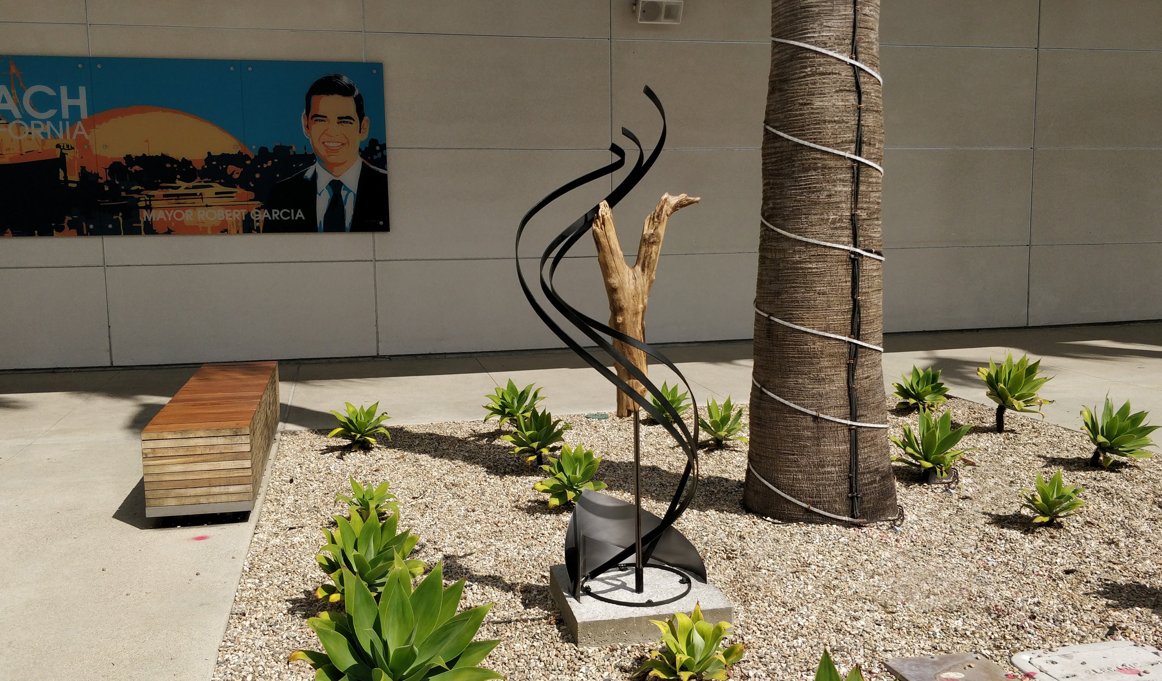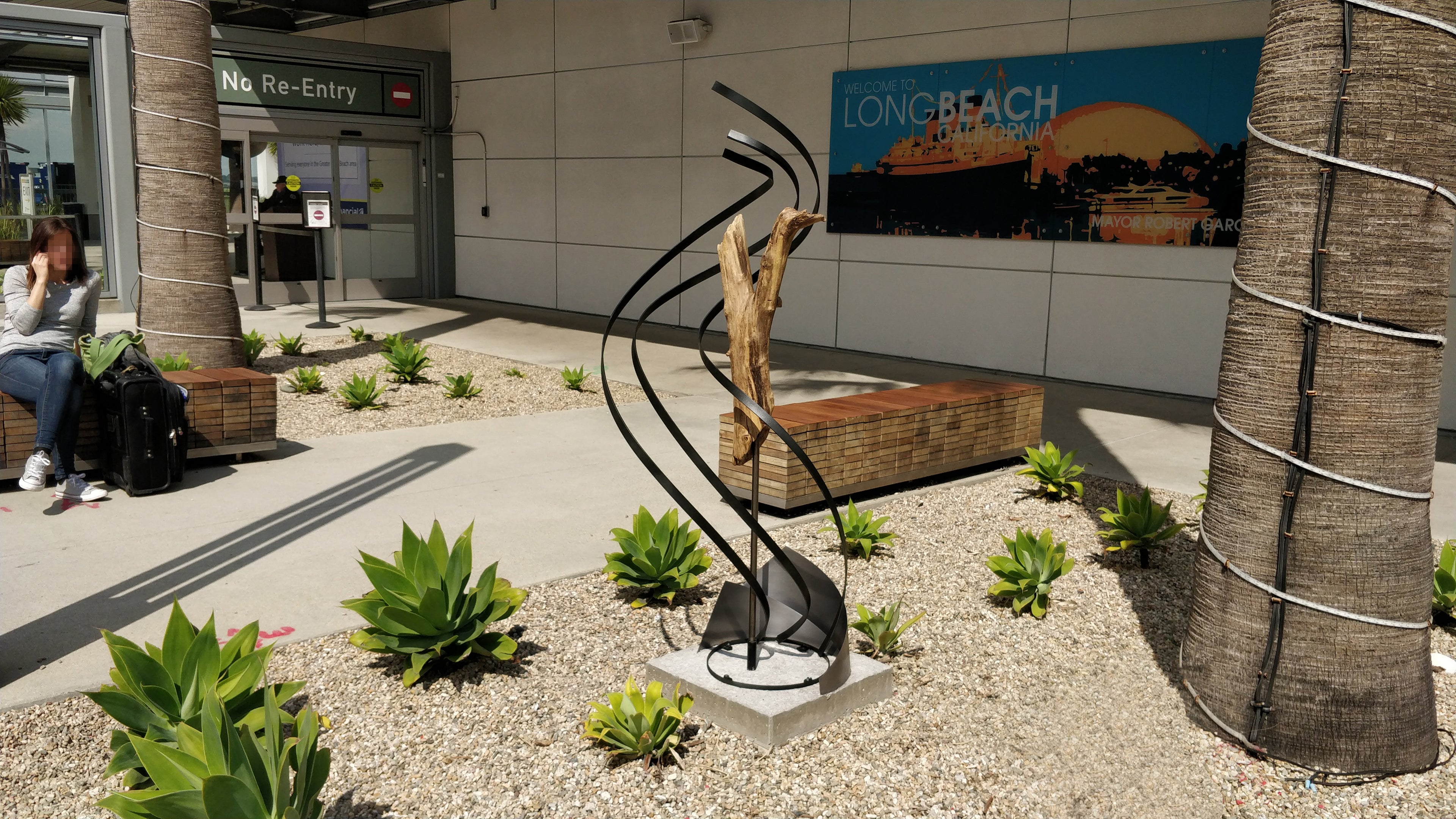 Drifting encourages the exploration of new paths and places using driftwood as a symbol among a swoop of steel from earth to sky. Seemingly frozen in an ongoing journey, the driftwood emphasizes the importance of being in the present, remembering the past, and being open to new paths. The materials recall Long Beach's industrious history and its rich, natural environments while highlighting concepts of travel and adventure. Modern minimalistic forms of industrious steel and concrete contrast with the warms of the natural form of the encapsulated wood. The driftwood is positioned at eye level to attract interaction and the sympathy of travelers as the steel forms guide the eye upward, like the airplanes taking flight beyond the artwork.