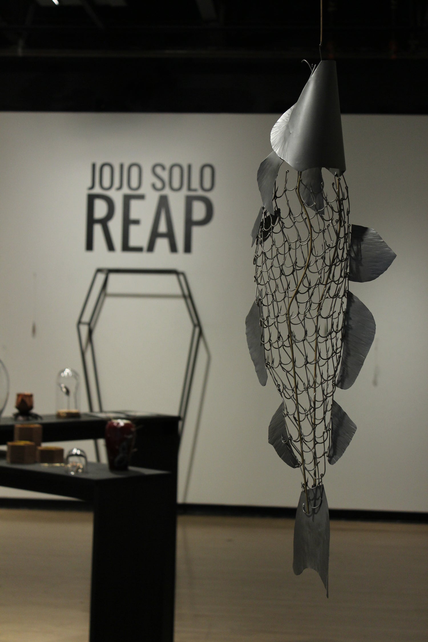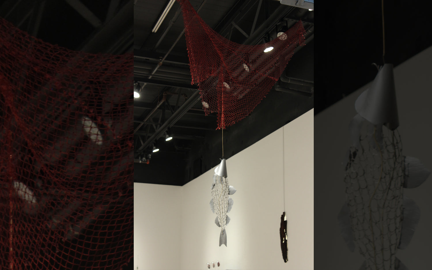 Atlantic Cod Sculpture made of Fishhooks, Mild Steel, and Bronze displayed with dyed red fish net hanging above. Each Fishhook was meticulously soldered together with silver solder.