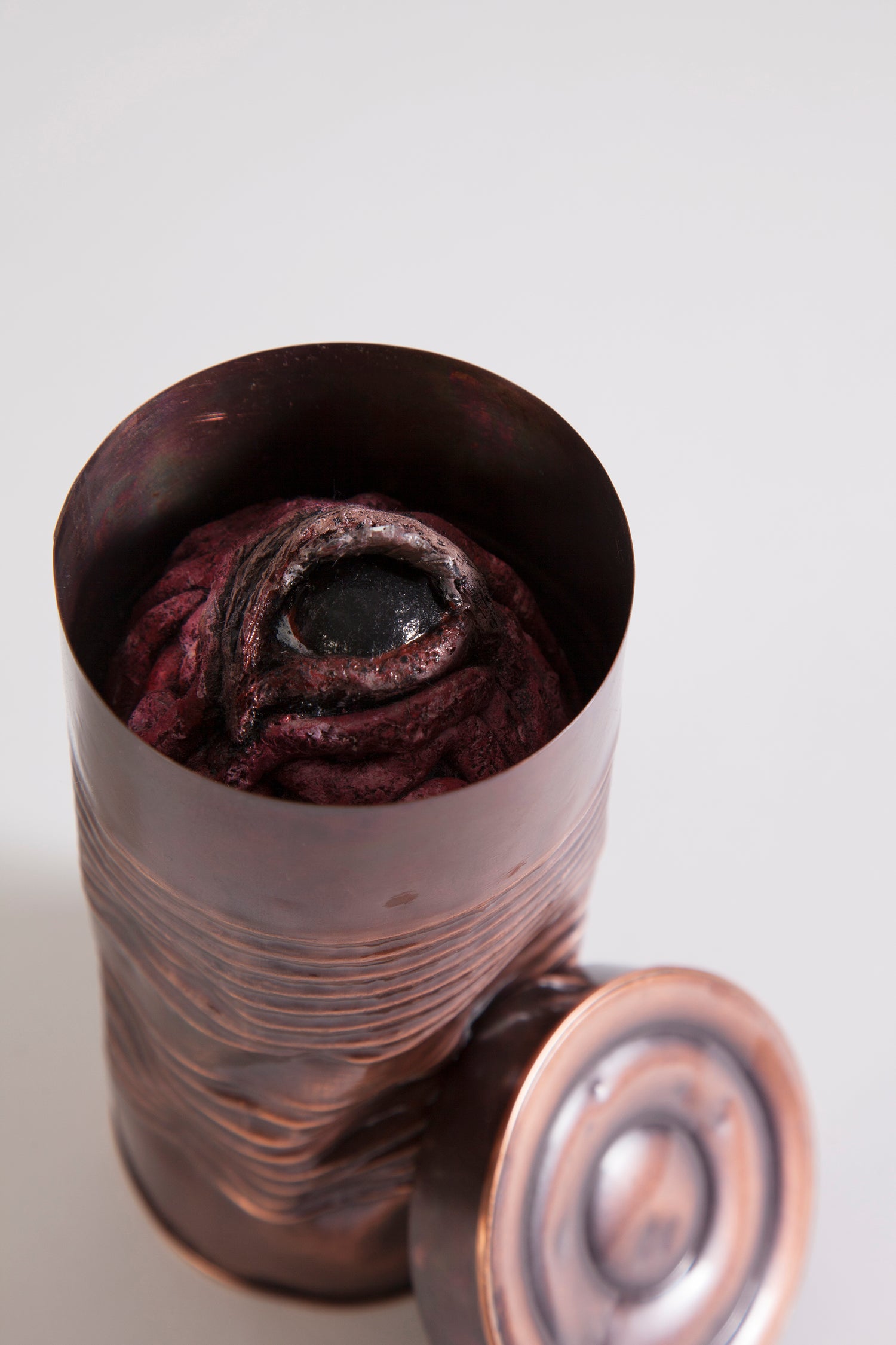 Copper lidded Vessel hand fabricated with polymer clay meat and cow eyeball painted with Acrylic and High Gloss Paint.