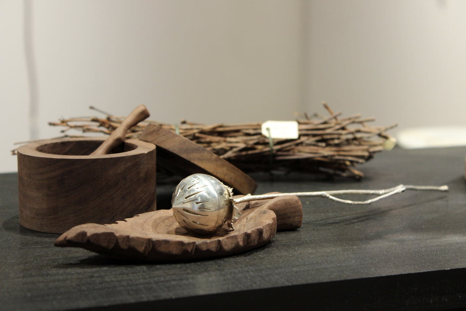 Hand Carved Walnut Leaf, Spoon, and Tea Canister for Sterling Silver Tea Infuser Set